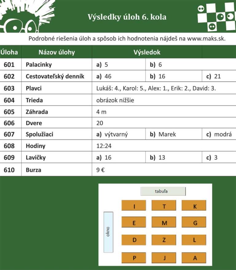 Aj po 6. kole 25 súťažiacim posielame perá. Veríme, že ich potešia a prinesú im šťastie. Kategória Maks 5 Bianka Reviľaková, Terézia Akuratná, Kristína Mazúrová, Samuel Alan Macko, Alexandra Fazekasová Kategória Maks 6 Andrej Souček, Natália Surová, Martin Mižák, Peter…
